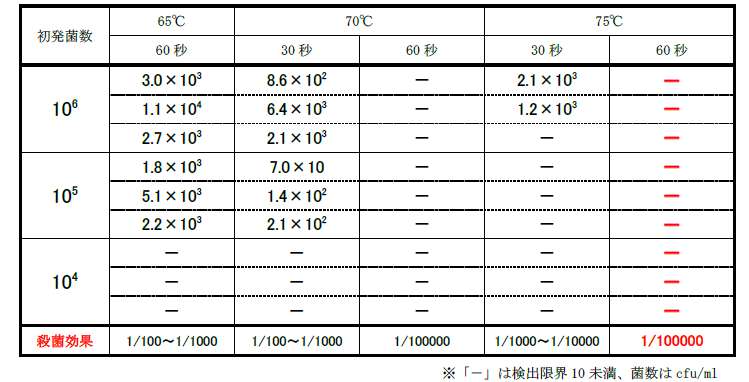 ①65℃・60秒、②70℃・30秒及び60秒、③75℃・30秒及び60秒の加熱条件で生残菌数を測定しました。